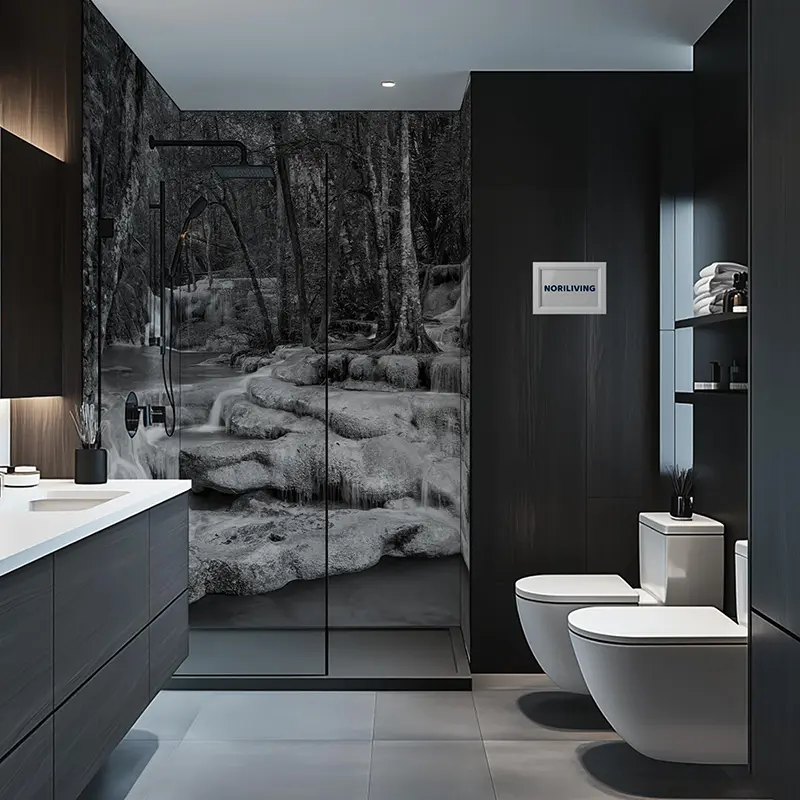 Duschrückwand Aluverbund Wald Bach Wasserfall 079 schwarz-weiß