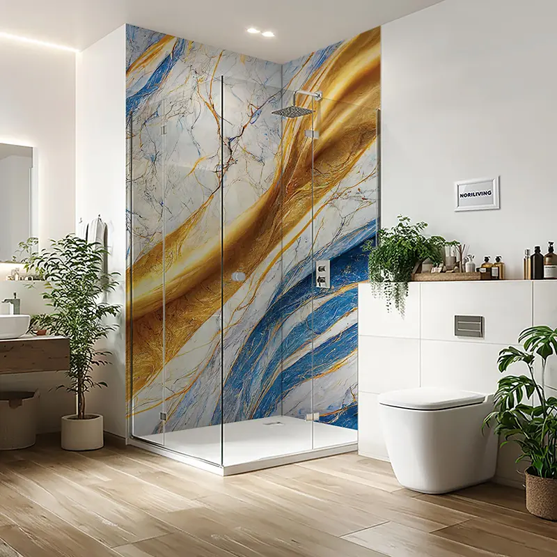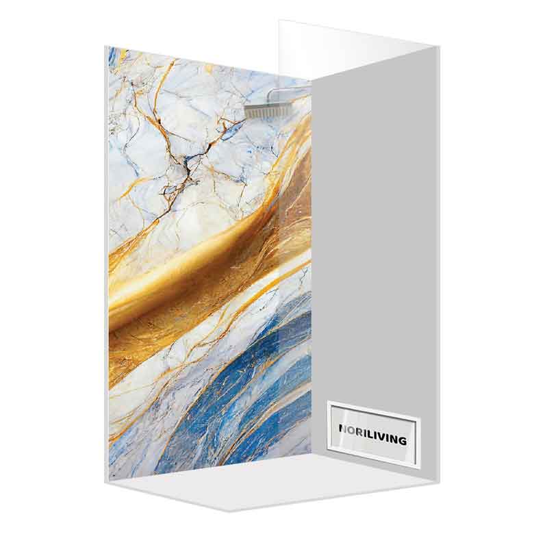 Duschrückwand Einzel | Ecke | Nische | Alu Marmor beige-signalblau mit goldfarbigen Einschlüssen 092